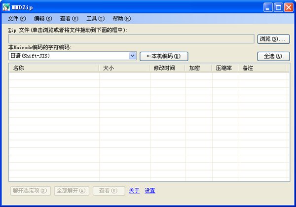 2、根据压缩文件中文件名的编码更改编码选项,让文件名能够正常显示。如果是日文,请使用Shift-JIS编码,简体中文请使用GB2312编码,繁体中文请使用BIG5编码。单击“本机编码”按钮将使用Windows的默认编码设置。