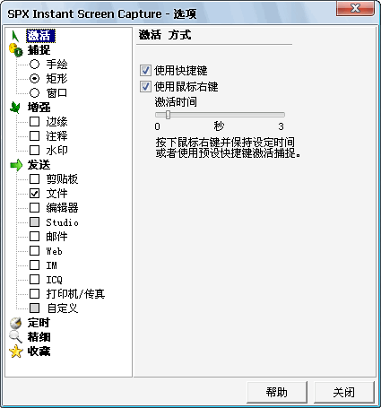 SPX Instant Screen Capture 是一小巧的屏幕抓图工具,可以抓取选定的区域或整个窗口,可以将抓取的图片发送到剪贴板或 email、图片编辑器或直接存为 BMP、GIF 等格式的文件。