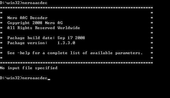 特点:一个命令行 Nero AAC编码解码器。由于没有图形用户界面,您需要从命令提示符/批处理文件或通过 Microsoft® Windows™“开始”菜单中的“运行”命令,来执行应用程序。其编码器需要采用 PCM 波形格式的 .WAV 文件作为输入,再以 MPEG-4/3GPP 文件格式的 MP4 作为输出,另外还需要设置质量/位速率值作为参数。解码器的部分则是采用 MPEG-4/3GPP 文件格式作为输入,提供 PCM 波形文件作为输出。有关此编码解码器的基本选项和高级选项的更详细信息,还可以参见压缩文件中提供的 readme.txt 文件。