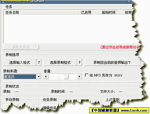 Absolute MP3 Recorder(录音软件) V1.1.35 绿色汉化版 Absolute MP3 Recorder 是一款绝对超值的录音软件。就和它的名字一样,它可以把任何音源传来的信号录制为MP3文件,而且可以进行音质选择。同时,它可以直接截取Media Player信号,甚至连一些有版权的Realplay网络广播信号也照录不误。利用它提供的定时录音功能,它还可以在无人职守的情况下自动录音。最后,更可贵的是,它不需要注册,没有广告条的打扰,是一款确对免费的软件。