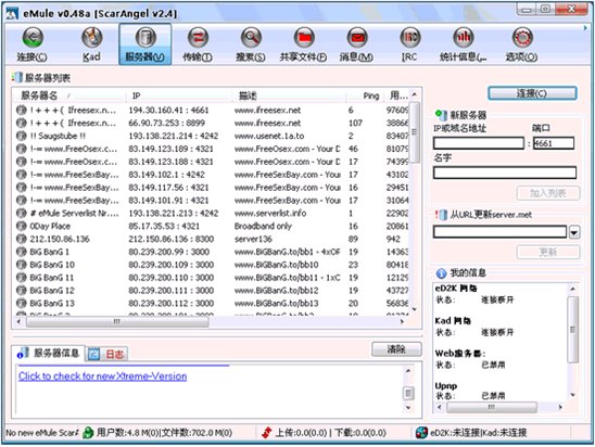 eMule V0.49a ScarAngel 3.0 多国语言绿色免费版 使用eMule,有人喜欢verycd的版本,有人喜欢Xtreme的版本。verycd可能会有搜索限制(中国特色的关键字过滤),Xtreme则是CPU占用可能会有些高。这个ScarAngel版本是StulleMule作者Stulle的一个MOD作品,基于Xtreme MOD修改。感觉他的目的是把MorphXT和Xtreme两个Mod的性能综合起来,无论是CPU占用还是一些独特功能上来说,表现都相当地不俗。最新版本基于eMule 0.48a Xtreme 6.1并且支持vs2003 SP1。