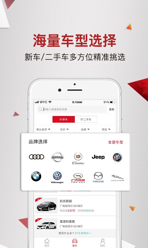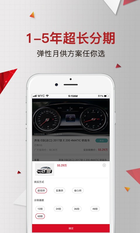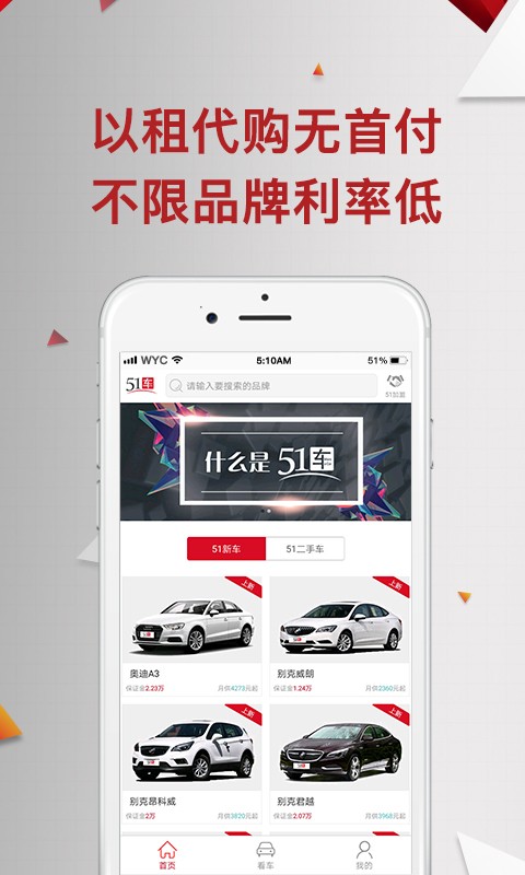 51车app是一款提供分期购车的软件,51车app为您提供全面的线上汽车金融产品和服务,主要包括新车、二手车以租代购等产品服务,为您轻松解决购车、租车资金问题!是国家商务部和税务总局批准的第十二批内资融资租赁试点企业。