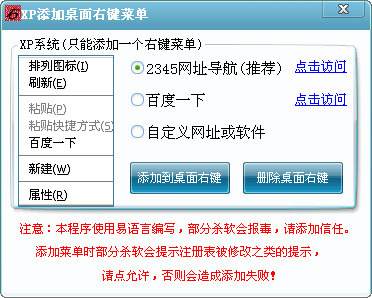 xp添加桌面右键菜单是一款往鼠标右键菜单里添加选项的绿色工具,可以用来为右键菜单加上自定义的链接,方便日常工作或学习操作。