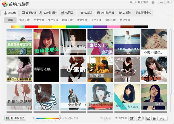 拉拉QQ助手软件自带数万QQ头像 ,QQ皮肤,qq表情,QQ分组,QQ签名等资源,并且保证做到每日更新,为您提供最全面QQ资源应用。拉拉QQ助手助您成为Q界达人!