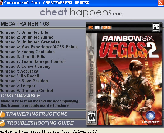 彩虹六号维加斯2修改器是同名游戏的修改工具,功能强大,使用简单,方便玩家更好地通过游戏关卡。彩虹六号:维加斯2十三项修改器,是同名游戏辅助修改工具,功能十分强大,增加了游戏进程速度,加快游戏乐趣,帮玩家节约了时间,帮助你轻轻松松通过难关,祝大家游戏愉快。