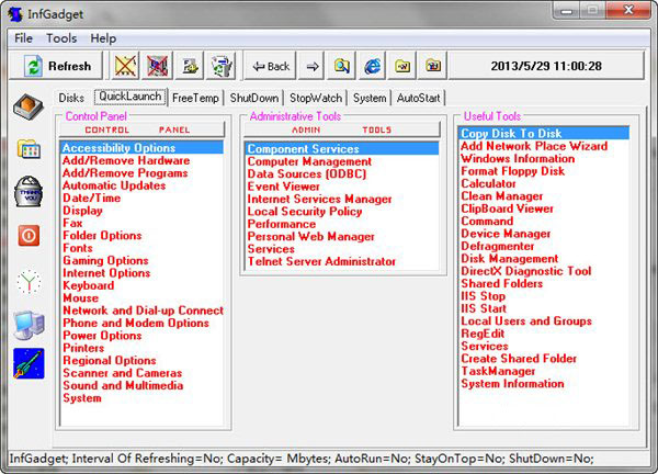 InfGadget是一个快速打开系统应用软件,包含了各种类别的系统应用,您可以启用的任务,如磁盘,快速启动,关机,秒表,自动启动或系统FreeTemp。