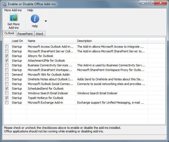 EnableDisable for Office可以列出Office各个组件的加载项,允许你禁用那些不必要的加载项,只需要点击一下鼠标就可以了。