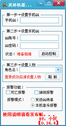 武林机器人是一款武林挂机软件,挂机外出用,比如早晨出门开请神挂机,结果挂机过程中被别的玩家杀了,导致人物在那个位置死一天,既不加经验也浪费电,本工具可以帮助您在外出的时候也可以得到人物的信息并远程操控,挂机死亡掉线报警。