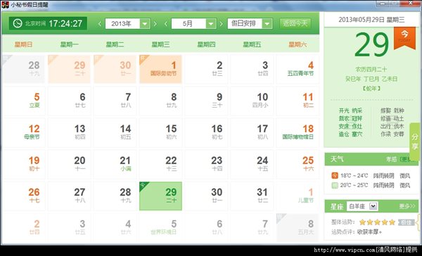 小秘书假日提醒 v1.0.04.08 绿色版 小秘书假日提醒为您提供最佳的日历体验! 您可以在日历里查看到前后100年的万年历、农历信息,还可以查看每天的黄历详情,当然还有今年的所有放假安排噢!在基础的日历信息的基础上,我们还加入了日程管理模块,您可以在这管理您的日程内容。