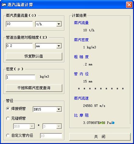蒸汽流速计算是一款方便于热工设计人员的工程计算工具,支持蒸汽流量计算,蒸汽密度计算,粗糙度计算,管径计算、蒸汽流速计算、比摩阻计算,质量流量、干饱和蒸汽密度查询等功能。