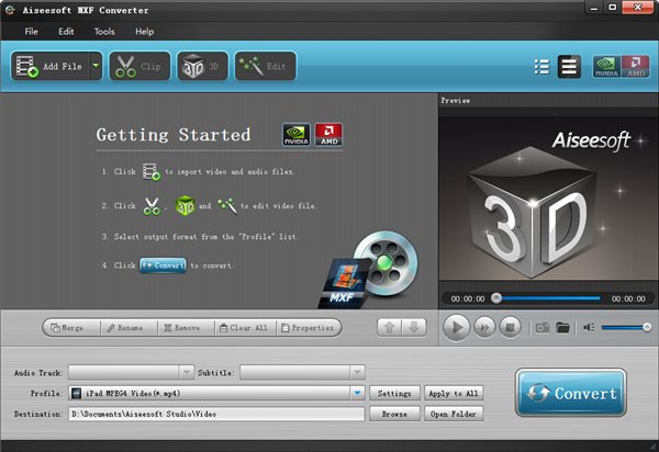 Aiseesoft MXF Converter能够将MXF/P2 MXF文件格式转换为MP4、3GP、AVI、MKV、WMV、FLV、SWF、VOB、DV等常用格式便于后期编辑,还可以转制成3D视频,当然也可以调节视频适配移动设备的分辨率大小。