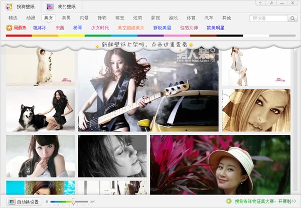 搜狗桌面壁纸是搜狗公司开发的一款桌面壁纸主题下载,应用的美化工具。搜狗桌面壁纸下载2013正式版是壁纸质量最高的壁纸客户端软件,集成万款美女、宠物、风景、电影、节日、日历、简约壁纸,一键更换壁纸,多分辨率自适应,支持分组播放。