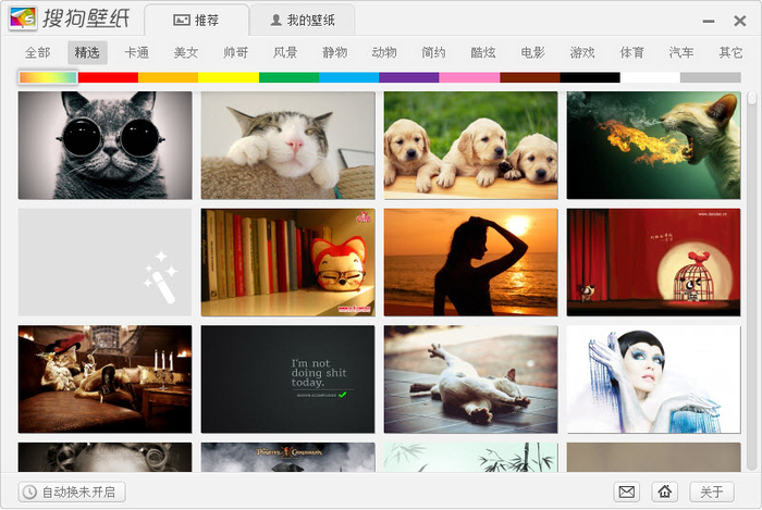 搜狗壁纸,搜狗桌面小组继搜狗输入法、搜狗浏览器后又一给力桌面产品,提供万款高清壁纸下载,自适应屏幕分辨率,点击即可更换壁纸,可设置壁纸自动更换及更换周期。十三大类题材,支持颜色分类,涵盖卡通、风景、美女、帅哥、电影、游戏、汽车、体育等,更有最新最炫的壁纸更新;支持导入本机壁纸,标记“我喜欢”,为你打造桌面专属风格。
