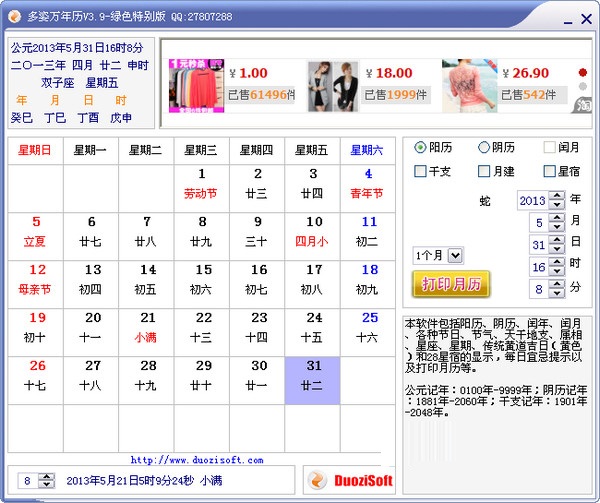 多姿万年历 v3.9.0.0 绿色版 多姿万年历包括阳历、阴历、闰年、闰月、各种节日、节气、天干地支、属相、星座、星期、传统黄道吉日(黄色)和28星宿的显示,每日宜忌提示以及打印月历等。从本版本多姿万年历开始支持月历的打印了,分别可以按1,2,4,6,8,10,12个月进行打印。公元记年:0100年-9999年;阴历记年:1881年-2060年;干支记年:1901年-2048年。