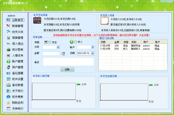 会生活家庭记账本 v2.9.2 绿色版 会生活家庭记账本是一款功能强大,简单,实用,易用,没有任何多余功能的家庭记账软件。她可以帮您轻松记录每天的收入、支出,并进行分析,汇总,让您更容易对收入和支出进行预算!使用会生活记账本,钱来钱往一目了然,让您轻松理财不再难! ---- 会赚钱,会花钱,会记账,会生活!