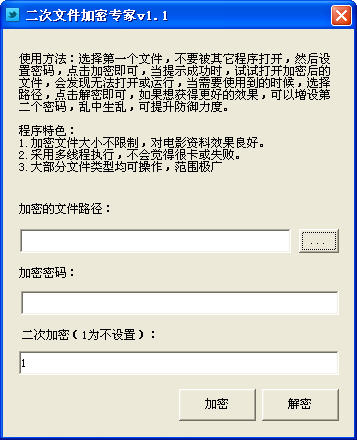 二次文件加密专家 V1.1绿色版 二次文件加密专家是一个文件加密工具,可以自由选择加密解密和二次加密,二次文件加密专家,加密文件没有大小限制,对电影资料效果良好,采用多线程执行,不会觉得很卡或失败,可加密大部分文件类型