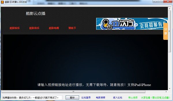 酷影云点播 v1.5 绿色版 酷影云点播是通过云加速在线观看视频的服务,视频下载地址、bt种子,均可直接在线观看,无需下载。