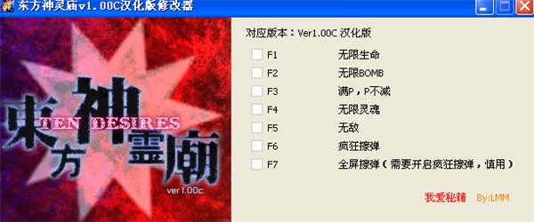 东方神灵庙七项修改器是同名游戏的辅助修改工具,提那家无敌,疯狂擦弹以及全屏擦弹等变态属性,充分满足玩家的各种需要,是你通关杀敌的好帮手。