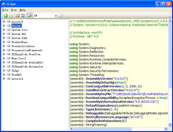 ILSpy是SharpDevelop小组的反编译工具,ILSPY这个开源工具的目的就是代替reflector的,它可以反编译出比reflector更好的C#代码。
