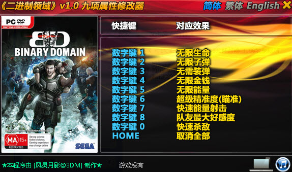 二进制领域九项修改器 v1.0 绿色版 二进制领域九项修改器,一款为同名游戏制作的辅助工具。功能强大,建议玩家根据自身游戏水平有选择的进行修改,这款修改器在各个方面都能给玩家带来帮助,欢迎使用。