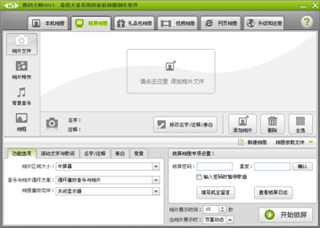 只要在制作好的本机电子相册基础上简单选择,软件即可自动转变成一个靓丽的多媒体锁屏系统,在您离开电脑时,不但可以展现您精心创作的精美相册,还可以实时锁定视窗并安全保护您的系统,实现文字留言、密码保护等各种先进功能,同时又兼具有屏幕保护用途,应用非常广泛,是独创的全新概念型跨界数码相册。