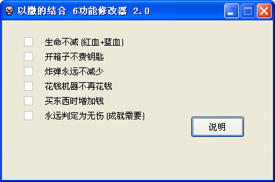 以撒的结合六项修改器,多功能辅助工具,拥有生命,炸弹等修改功能,能帮助您轻松完成游戏。以撒的结合修改器补丁,功能非常强大,解压缩,直接运行EXE文件即可。