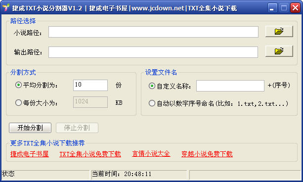 捷成小说分割器 v1.3 绿色版 捷成小说分割器是一款免费的小说TXT分割工具,无需安装,直接运行,分割后的TXT文本文件放入手机方便阅读。