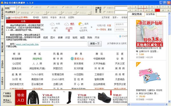 淘金币全额兑换捕快是一款为淘宝买家制作的一键搜索淘金币全额兑换的工具,器功能包括把淘金币36个分类项,传授淘金币获得技巧,使你的淘金币越来越多。软件界面简洁,只有一百几十KB,完全绿化,只有一个单EXE运行文件,方便您随时随地的备份和运行,还等什么,快到兑换宝贝呀。