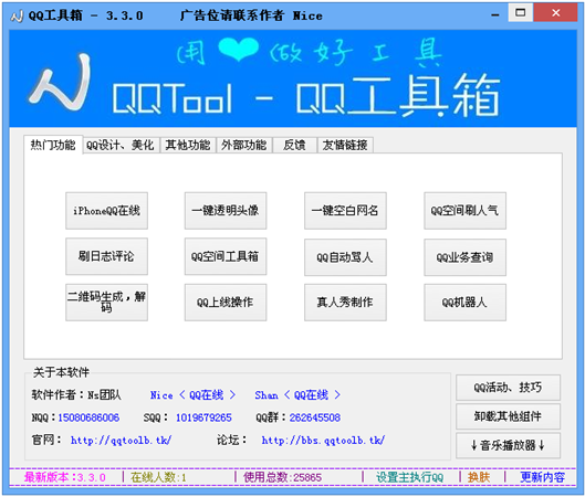 qqtool是一款功能强大的qq工具箱,qqtool的功能很多:有iPhoneQQ在线、企业QQ在线辅助、一键QQ透明头像、一键QQ空白网名、QQ空间刷留言、QQ空间刷人气、QQ空间刷日志人气、真人秀制作、QQ业务查询、QQ自动骂人等50多项功能,随着版本的更新而完善更多的功能,志在打造最强大的qq工具箱软件,敬请期待。