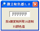 微尘取色器下载1.0 绿色版 微尘取色精灵是一款电脑屏幕取色器,样子小巧,操作简单。开启软件后,在鼠标指向区域按A键就可以复制所取16进制颜色值,非常号用。欢迎下载体验。