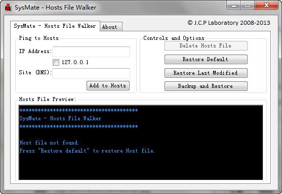 SysMate-Hosts File Walker还带有备份、还原、恢复hosts文件到默认状态这些功能。如果你经常修改hosts文件,那么这是一个非常有用的软件哦。