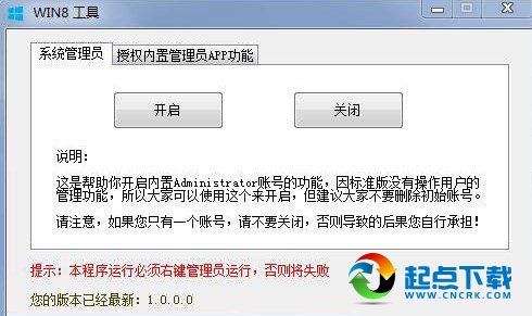 Win8工具 V1.0绿色版 Win8工具是一款win8 下运行的小工具,win8工具主要用于win8标准版用户的获取administrator账户的启用,同时对administrator下app应用的授权(也就是用administrator下打开 天气、资讯、人脉等其他应用提示“只能用内置账号打开”的限制),方便大家使用,后续会增加一些其他功能。
