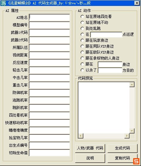 流星蝴蝶剑AI代码生成器用于游戏中的NPC生成动作的工具,是一款非常好的代码生成器.