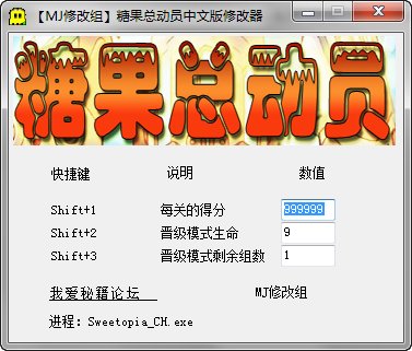 糖果总动员修改器+3 v1.0 免费版 糖果总动员修改器是同名游戏的辅助工具,可以修改每关得分,晋级模式生命,晋级模式剩余组数。帮你更轻松的玩游戏