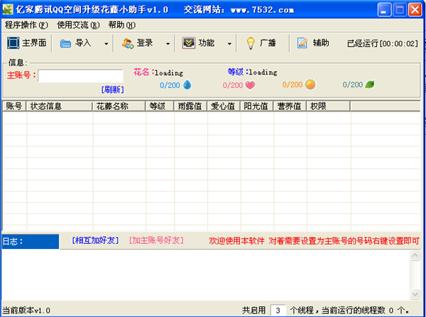 亿家腾讯QQ空间升级花藤小助手是一款纯辅助工具;助手支挂批量登录小号,支持小号,帮大号施肥、浇水、修剪、日晒等等操作;欢迎下载使用。