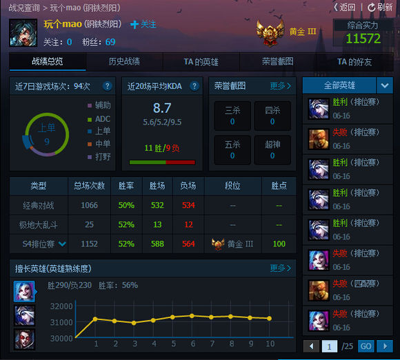 2、点击战绩总览,可以看到自己近七日的位置使用情况;最近20场的平均表现,KDA越高表示每次死亡所带来的价值越高;右上角可以看到自己所处的段位。