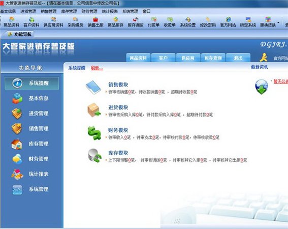 基本功能:进货入库、进货退回、销售出库、销售退货、报损、报溢、分库调拨(支持异价调拨)、拆零、组装、盘点、收款、付款、预收、预付、收入、支出、成本、利润核算等。
