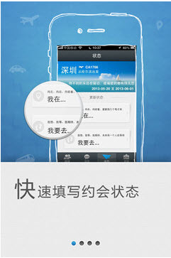 1、我在”及“我要去”,快速确定约会城市和接受约会的时间段,系统会立即呈现有共同约会需求的用户列表,没有时间交集的用户会被系统自动过滤。2、只有设置了约会状态,才能查看陌生用户,并与之交流,如果约会状态失效(过了设定离开时间),陌生用户则无法查询到你,避免在你不方便的时候,受到骚扰。