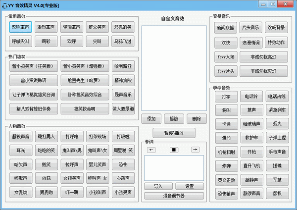 yy音效精灵是一款利于玩yy语音和is语音以及qqtalk语音的朋友的工具,软件内包括群众笑声,尖叫声,掌声,婴儿笑声,狗叫声,打呼噜,打喷嚏,乌鸦飞过等等各种音效。