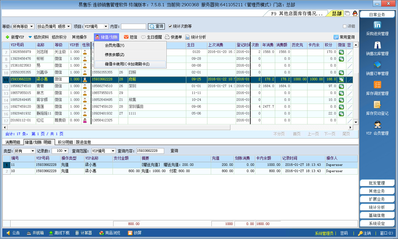 2)支持会员积分管理,会员价格管理,会员储值管理。