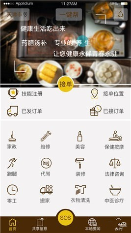 一键帮App是一个劳动服务信息对接的软件。是以接发单方式,将临时劳动服务供需双方的信息,进行快速对接的软件。用户通过点选劳动服务需求内容和位置设定后,便可进行发单,本地的劳动服务方可通过接单或抢单的方式,快速的与您对接,使您的劳动服务需求得到快速解决。各类专业劳动服务机构或个人,只需在本软件进行技能注册,便可接单或抢单,特别是因工作时间不能固定而不好找工作的群体,可以在本软件进行个人技能注册,在您所设定的接单位置区域内,如有与您所注册技能相应的劳动服务需求信息,您的手机会及时提示您,您可根据个人时间和情况的安排,进行接单或抢单。通过接单或抢单的方式,进行劳动输出,为他人提供劳动服务。