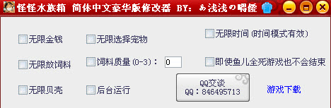 怪怪水族箱修改器+8 v1.0 中文版 怪怪水族箱修改器是同名游戏的多功能辅助工具,一共八个选项,帮助玩家快速完成游戏。怪怪水族箱是一款2D画面风格的模拟经营类游戏,游戏中,玩家作为一个养鱼专业户,需要利用养鱼来获得更多的金钱,同时还要保护鱼儿不受其他怪物的骚扰,一款很休闲很有爱的小游戏,适合茶余饭后休闲解闷只用