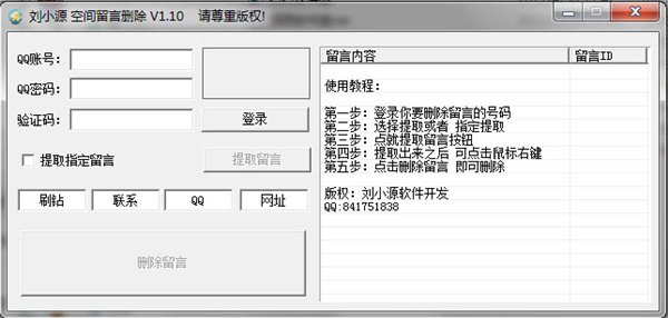 刘小源QQ空间留言删除是专用于删除qq空间留言版的辅助工具。q空间中经常有一些恶意留言,比如说广告图片之类的。还有的是你不想看到的留言,这都可以通过刘小源空间留言删除这款软件来解决!