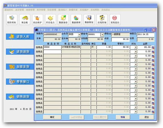 赛管家茶叶专用版专用于茶叶批发、专卖店、零售店管理系统(系统有配带视频教程,可到公司网站下载)。