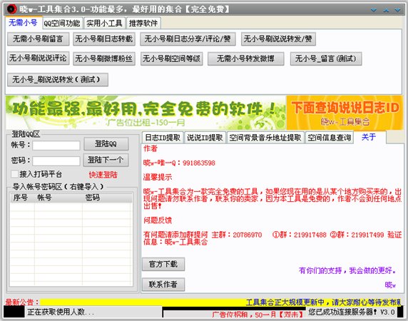晓Wqq工具箱集合是一款贴心的qq功能辅助工具箱。本款qq工具集合箱页面简洁,操作简单。是QQ爱好者难得的一款好工具。具有空间快速留言、日志智能评论、刷礼物、刷魅力苹果状态登录、空间互踩等等几十种功能,欢迎下载使用。