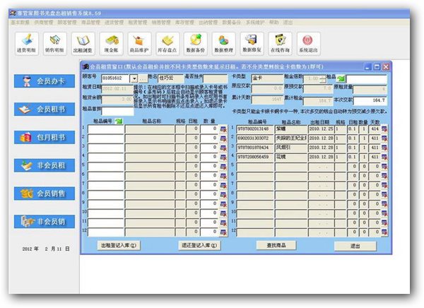 ◆产品特点:1.建库快速;2.操作简单:同窗口可进行出租、退还登记录入(免切换、可连续),按卡号、货号录入后能自动显示相关信息且一次能录入12种不同信息。录入商品、顾客信息既可按拼音也可按编号录入,非常方便。只将平时手工登记工作改为电脑录入而已,工作流程与平时运作相同,且操作提示清楚,免培训即可上机;3.功能完备:集出租、进销存、存取款三大功能于一体;4.管理严密:系统具有权限设置功能;现金账分业主、员工两个窗口,能有效保护商业秘密外泄;具有防修改功能,可有效杜绝管理漏洞;具有数据清除、清理功能,可及时清除不必要或不方便保存量大的数据。