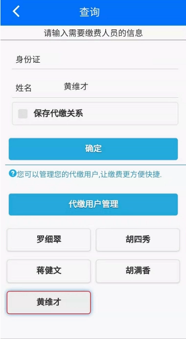 用户能够替他人缴费,只需点击【代人缴费】,于代人缴费页面填入被代缴用户的身份证号码与姓名,接着点击【确认】,随即进入缴费查询界面。