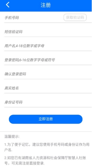 (2)在注册页面输入手机号码,接着点击【获取验证码】按钮以获取验证码。随后,输入短信验证码、用户名、密码、真实姓名、身份证号等真实信息,完成后点击【立即注册】。注册成功后,就能使用首页的各类功能。