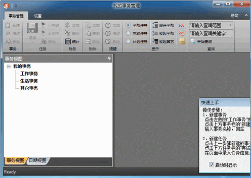 1.软件把事务分成三类:工作事务,生活事务,其它事务,为每项事务建立一个专用文件夹,以方便文件管理。