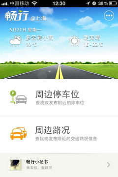 畅行是一款根据GPS查找周边实时停车位信息、加油站信息和道路交通路况的出行类手机地图导航应用。根据GPS位置获取当地的实时出行天气信息和当地实时油价,在路上可以随时查找周边的停车位、查看路况简报和实时交通路况信息(以绿、橙、红三种颜色实时形成的城市道路实时交通信息网),并且这些数据都是实时的!自由切换全地图/半地图列表模式,全方位掌控出行信息,而且更有周边加油站信息为您的出行保驾持航。更有行车记录仪帮您记录出行每一步。同时您也可以将停车位或路况信息一键分享到微博、微信,帮助更多的畅友了解到实时的出行信息,解决了从出发到目的地的所有出行难题,让大家一路畅行。